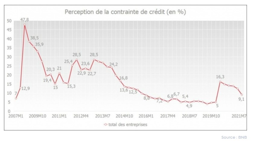 L'enquête trimestrielle de la Banque nationale de Belgique (BNB) montre que la perception des freins au crédit par les entreprises a diminué au cours de l'année écoulée. Le pourcentage est passé de 16,3% en avril 2020 à 9,1% en juillet 2021. L'augmentation observée à la suite de la crise a donc quasiment été éliminée.