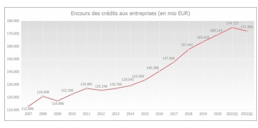 À la fin du mois de juin 2021, l'encours des crédits utilisés par les entreprises (y compris les crédits d'engagement, par exemple les crédits de garantie et les crédits documentaires) s'élevait à 171,9 milliards d'euros.