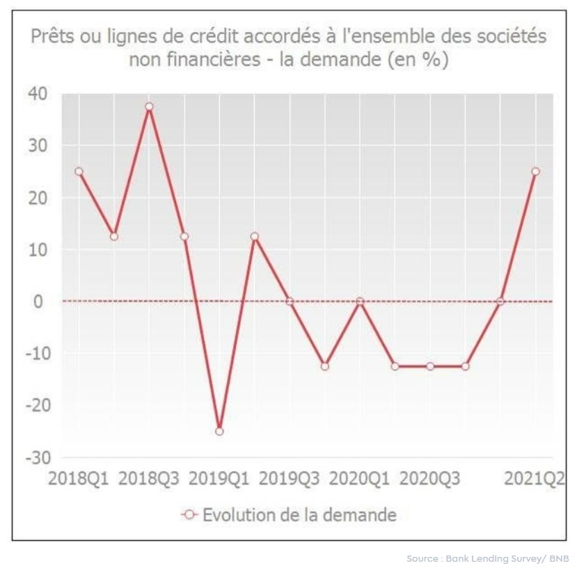 Dans l'enquête BLS (Bank Lending Survey) de la Banque nationale de Belgique (BNB), les banques ont toutefois indiqué une augmentation de la demande de crédit au deuxième trimestre 2021. La demande des entreprises de financement des investissements fixes, des stocks et des fonds de roulement a été particulièrement forte.