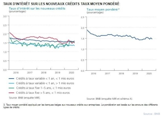 Selon les données de la BNB, le taux d'intérêt moyen pondéré sur les nouveaux crédits aux entreprises était très bas, à 1,47%, en septembre 2020 (contre 1,52% en août 2020). Depuis avril 2019 déjà, le taux d'intérêt moyen pondéré fluctue autour de 1,50 %.