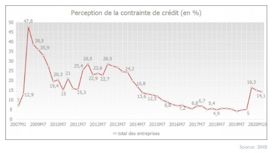 L’enquête trimestrielle de la BNB indique que la perception des freins au crédit par les entreprises était de 14,1 % en octobre 2020, venant de 5,0 % en janvier, puis de 16,3 % en avril. La perception des freins au crédit est toujours sensiblement plus faible que durant la crise bancaire de 2008 - 2009.