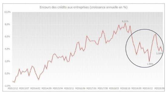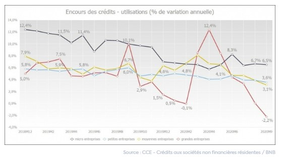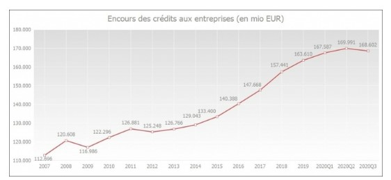 Fin septembre 2020, l'encours des crédits utilisés aux entreprises (y compris les crédits d'engagement, par exemple les crédits de garantie et les crédits documentaires) est tombé à un niveau de 168,6 milliards d'euros, après un pic de 170,7 milliards d'euros à la fin mai 2020. Sur une base annuelle (comparaison entre septembre 2019 et 2020), l'encours a augmenté de 3,6 %. En juin 2020, la croissance annuelle était encore de 4,5 %.