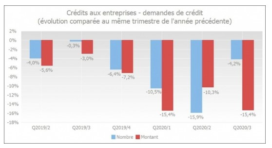 Au troisième trimestre 2020, les entrepreneurs ont demandé 4,2 % de crédits de moins que durant la même période de l'an dernier. C'est là la septième diminution consécutive. En termes de montant, la baisse a été plus importante, à savoir 15,4 %. Cette forte contraction du montant tient principalement à un recul au niveau des grandes entreprises dont les montants moyens des crédits utilisés sont généralement plus élevés.
