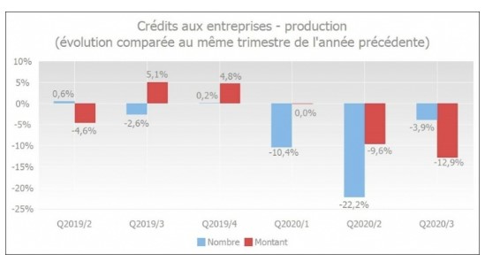 La crise du coronavirus pèse lourdement sur l'activité économique. Les entreprises ont donc moins besoin de crédits pour financer leur fonds de roulement et leurs investissements. Au troisième trimestre 2020, le nombre de demandes de crédits aux entreprises a de nouveau diminué par rapport à la même période en 2019. Cette baisse s'est également marquée au niveau de la production de nouveaux crédits.