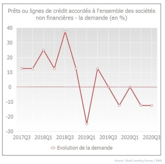 Dans l'enquête BLS (Bank Lending Survey) de la Banque nationale de Belgique (BNB), les banques ont également indiqué que la demande de crédit était moindre au troisième trimestre 2020. En particulier, la demande de crédits pour le financement d'investissements fixes de la part des entreprises a diminué. C'est ce qui ressort également de la mise à jour mensuelle ERMG de la BNB (édition du 17 novembre 2020) dans laquelle les entreprises indiquent que la crise du coronavirus aurait entraîné une réduction de leurs investissements de 25 % en 2020.