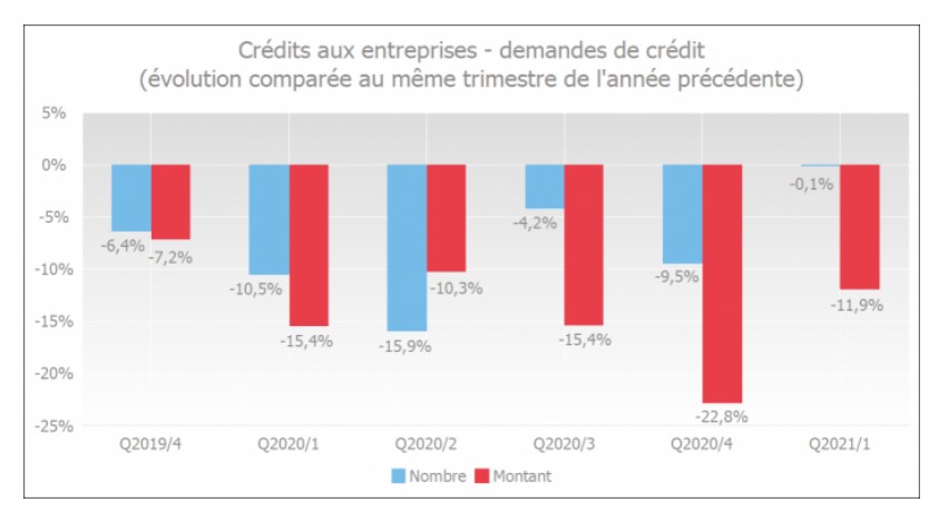 Au premier trimestre 2021, les entrepreneurs ont demandé 0,1 % de crédits de moins par rapport à la même période de l'année précédente. Il s'agit de la neuvième baisse consécutive. En montants, la baisse a été plus importante, à savoir de 11,9%, ce qui constitue la dixième baisse consécutive.