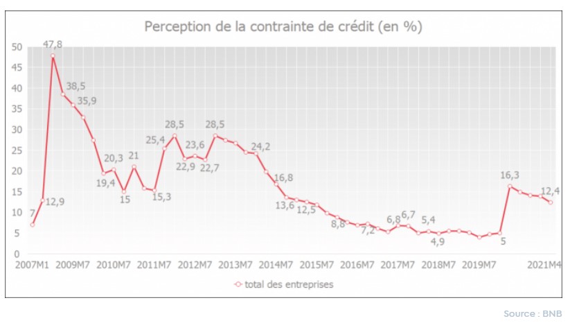 L'enquête trimestrielle de la Banque nationale de Belgique (BNB) montre que la perception des contraintes de crédit par les entreprises a diminué au cours de l'année écoulée. Le pourcentage est passé de 16,3% en avril 2020 à 12,4% en avril 2021.