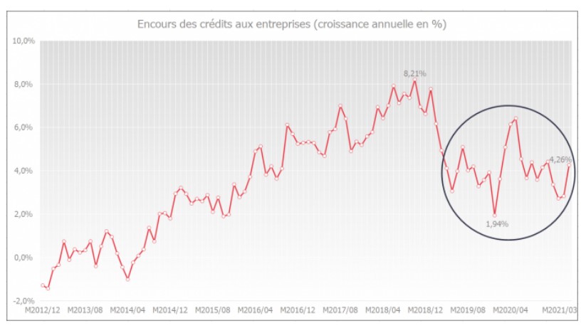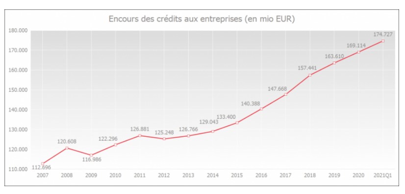 À la fin du mois de mars 2021, l'encours des crédits aux entreprises utilisés (y compris les crédits d'engagement, qui sont par exemple des crédits de garantie et des crédits documentaires) a atteint un nouveau record de 174,7 milliards d'euros, contre 169,1 milliards d'euros à la fin du mois de décembre 2020.