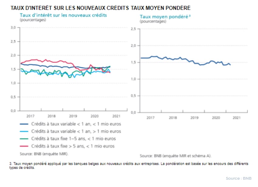 Selon les données de la BNB, le taux d'intérêt moyen pondéré des nouveaux crédits aux entreprises en mars 2021 se situait au niveau très bas de 1,42% (contre 1,47% en février 2021). Depuis avril 2019 déjà, le taux d'intérêt moyen pondéré oscille autour de 1,50 %.