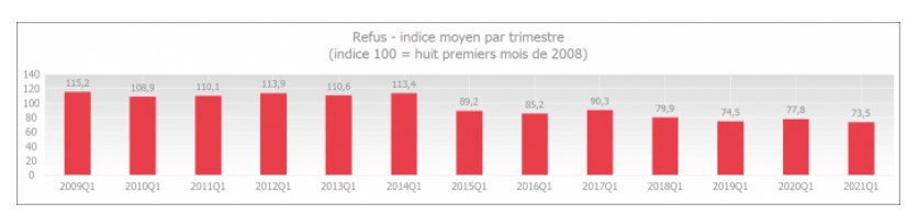 Le degré de refus est à son plus bas niveau, si l’on compare avec tous les premiers trimestres depuis le début des mesures. Compte tenu de la situation économique et sanitaire difficile qui a certainement un impact négatif sur la qualité de très nombreuses demandes de crédits, il est remarquable que le degré de refus soit si faible.