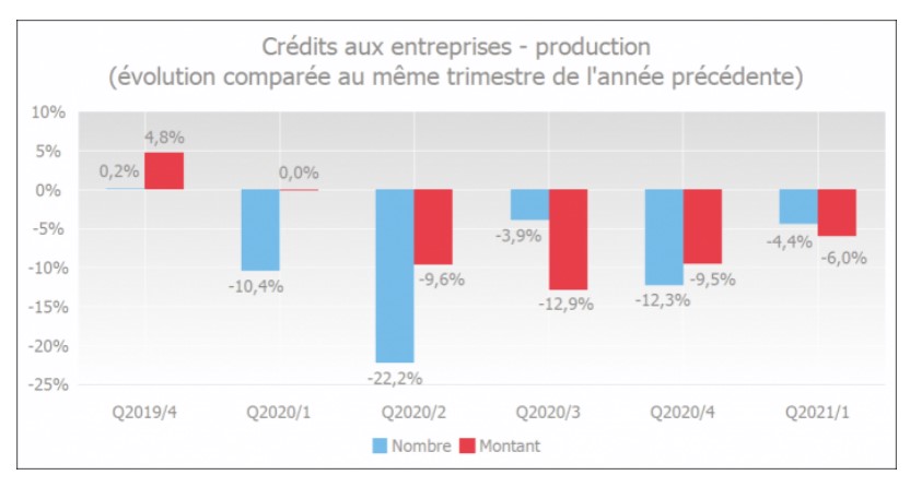 Au premier trimestre de 2021, la demande de crédits de la part des entreprises a été moindre qu'au cours de la même période de 2020. Cette baisse s’est également notée dans la production de nouveaux crédits.