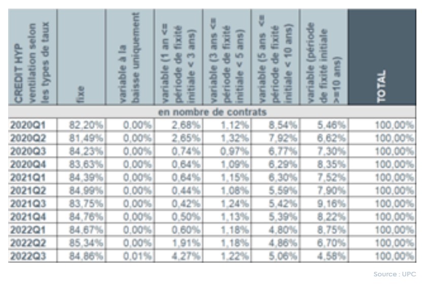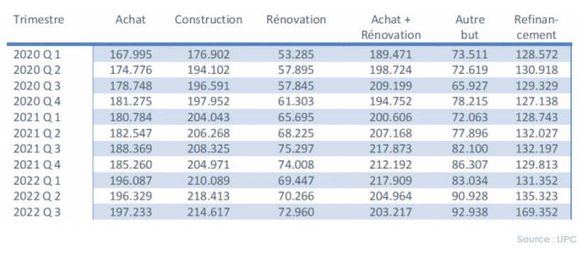 Toutes les statistiques en matière de crédit hypothécaire (2000 – 2022Q3), ventilées selon la destination du crédit et le type de taux d’intérêt, sont disponibles sur le site internet de l’UPC sous la rubrique « Presse et chiffres ».