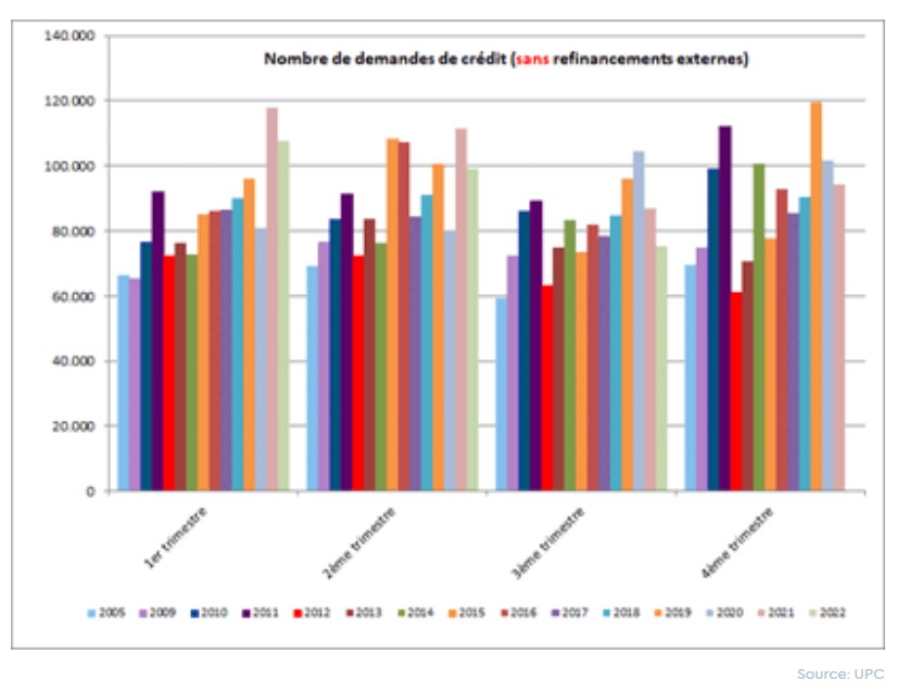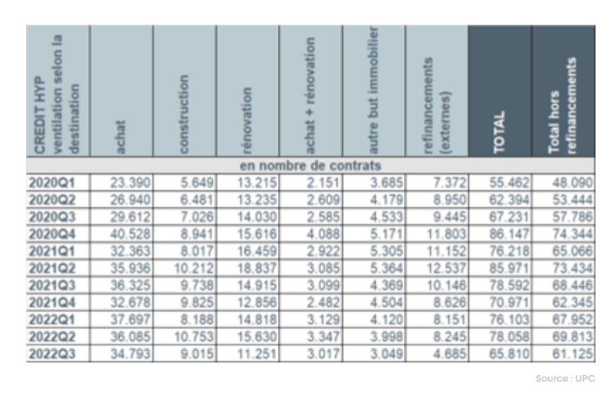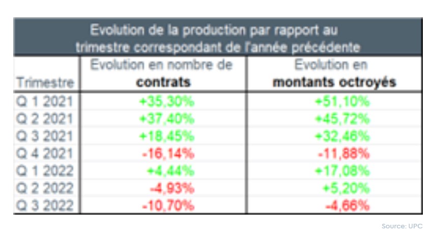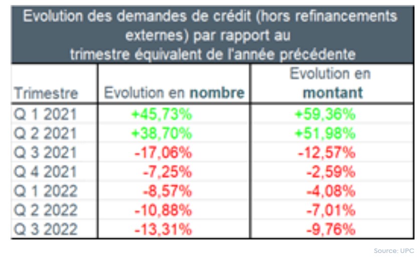 Le nombre de demandes de crédit a connu au troisième trimestre 2022 une réduction de plus de 13%, hors refinancements, par rapport au troisième trimestre de 2021. Le montant de crédit correspondant durant ce troisième trimestre 2022 s’est également contracté, de presque 10%.