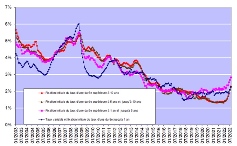 Compte tenu des taux d’intérêt en augmentation (voir graphique ci-après), les consommateurs belges continuent donc de privilégier très largement la sécurité. Le nombre de personnes qui optent pour un taux d’intérêt variable reste faible. Mais la législation protège aussi particulièrement le consommateur qui opte pour un taux d’intérêt variable. C’est ainsi que ce taux ne peut, après adaptation en fonction de l’évolution des indices de référence applicables, jamais excéder le double du taux d’intérêt initial.