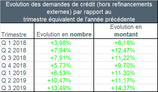 Le nombre de demandes de crédit a connu au troisième trimestre 2019 une augmentation de 13,5%, hors refinancements, par rapport au même trimestre de l’année précédente. Le montant de crédit correspondant a également connu une hausse, de 14,4% précisément.