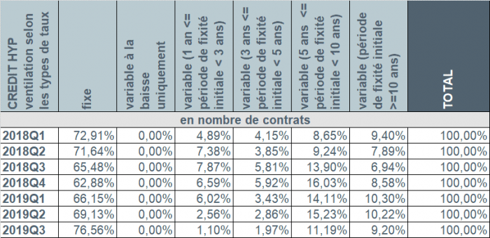 Au cours du troisième trimestre 2019, 8 emprunteurs sur 10 (86%) ont opté pour un taux d’intérêt fixe ou un taux d’intérêt variable assorti d’une période initiale de fixité des taux de minimum 10 ans. Environ 13% des emprunteurs ont privilégié un taux d’intérêt variable assorti d’une période initiale de fixité des taux entre 3 et 10 ans. Comme au trimestre précédent, le nombre d’emprunteurs ayant choisi un taux variable annuellement a diminué pour n’atteindre qu’un peu plus de 1%.