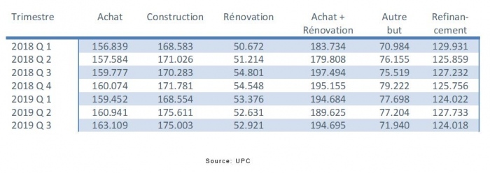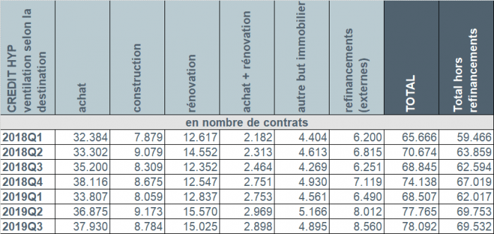 Comparativement au troisième trimestre de 2018, le nombre de crédits contractés pour la rénovation d’un logement a enregistré l’augmentation la plus élevée en pourcentage, à savoir +21,6% ou 2.673 contrats de plus. Le nombre de contrats de crédit pour l’achat d’un logement (+2.730) a progressé au troisième trimestre 2019 de 7,8% par rapport au troisième trimestre de 2018. Le nombre de crédits pour l’achat avec transformation (+434) a augmenté de 17,6%, tout comme le nombre de crédits de construction (+475), qui a connu une croissance de 5,7%. Le nombre de crédits pour d’autres destinations (+626) a quant à lui fait un bond en avant de 14,7%.
