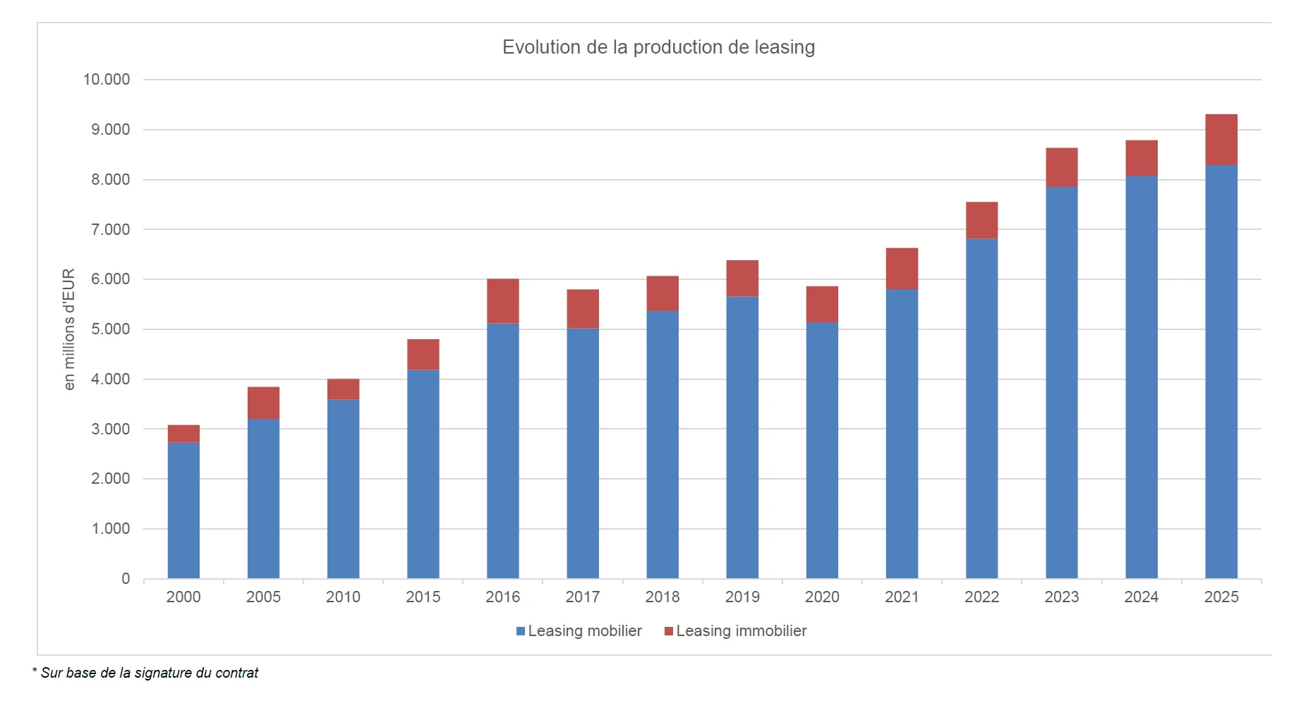 L’évolution positive du marché du leasing se reflète tant dans la production que dans l’encours. La production totale (leasing mobilier et immobilier) a enregistré une progression de 6,0 % en 2025 par rapport à 2024, pour atteindre 9,3 milliards d’euros.