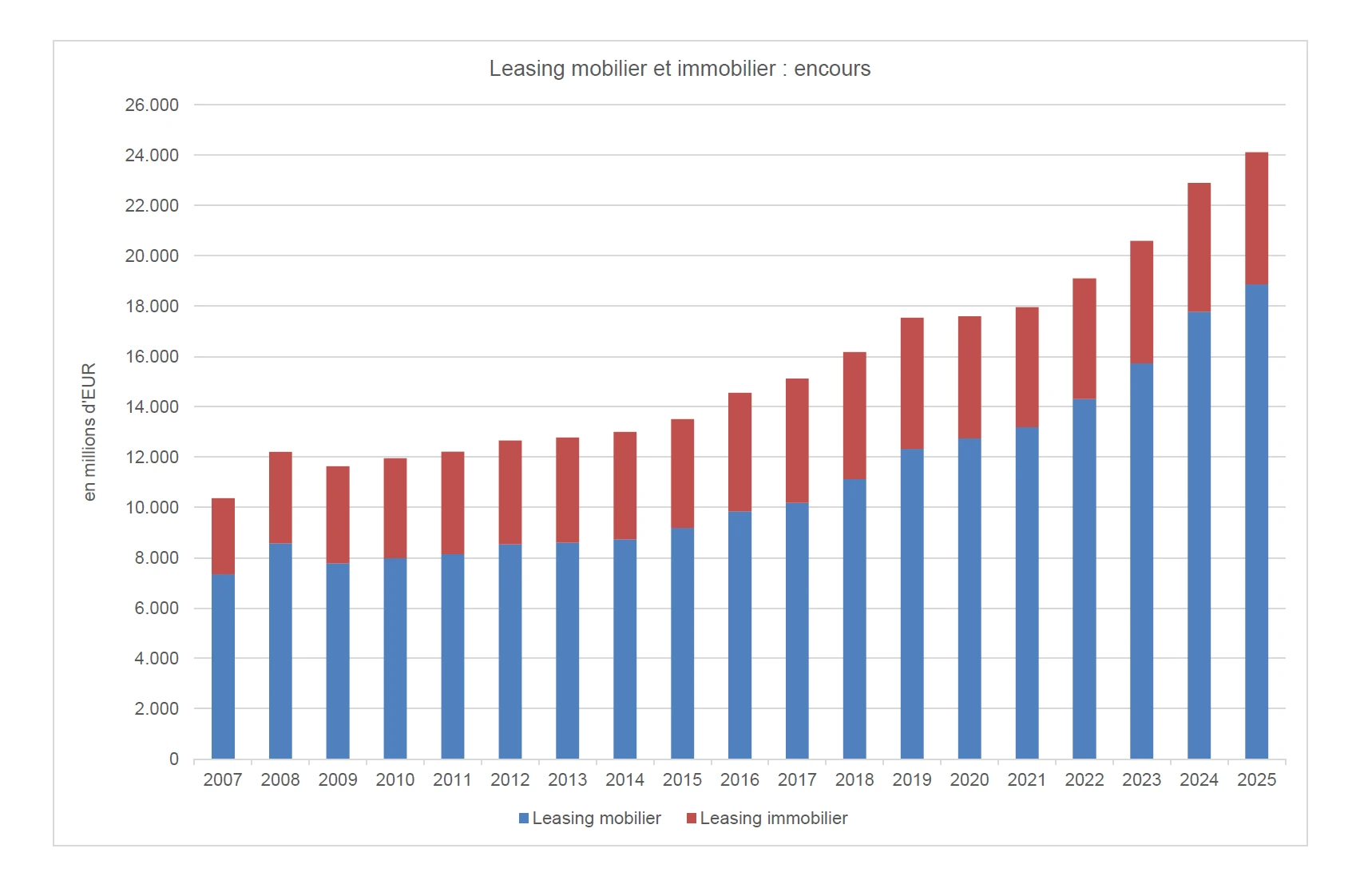 L'encours reflète également la poursuite de la croissance du secteur. Fin 2025, l’encours de leasing mobilier et immobilier avait augmenté de 5,3 % par rapport à l'année précédente, pour atteindre un volume de 24,1 milliards d'euros.