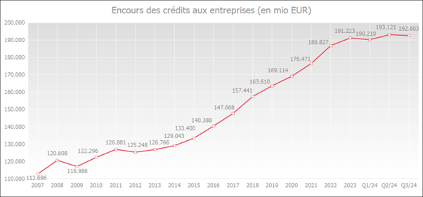 À la fin du mois de septembre 2024, l'encours des crédits aux entreprises utilisés, y compris les crédits d'engagement (par exemple des crédits de garantie ou des crédits documentaires), s’élevait à 192,6 milliards d’euros, ce qui représente 2,0 % de plus qu’un an auparavant.