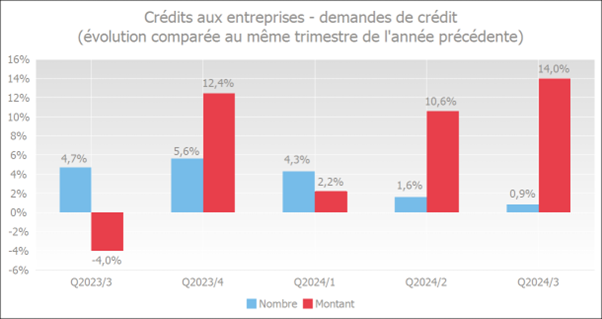 Au troisième trimestre 2024, les demandes de crédits des entreprises ont augmenté de 0,9 % par rapport à la même période de 2023, le montant total de ces demandes a même bondi de 14,0 %.