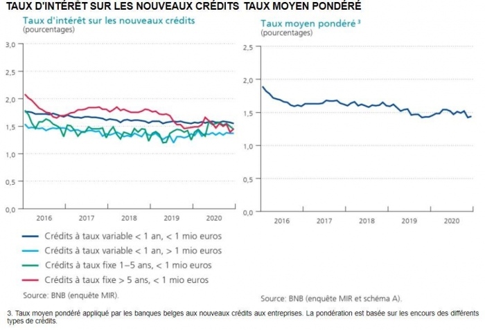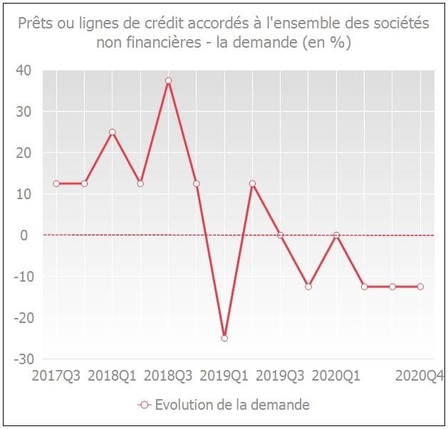 L'enquête sur les crédits bancaires (BLS) de la Banque nationale de Belgique (BNB) a également révélé une baisse de la demande de crédit au quatrième trimestre 2020. En particulier, la demande de crédit des entreprises pour financer des investissements fixes, des stocks et le fonds de roulement a diminué.