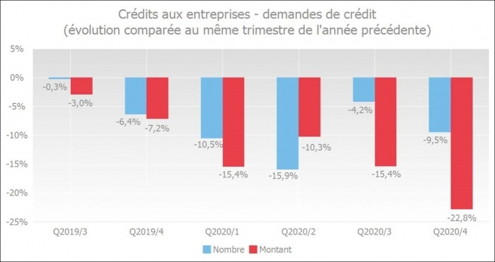 Au quatrième trimestre 2020, le nombre de demandes de crédit présentées par les entrepreneurs était inférieur de 9,5 % à celui de la même période de l'année précédente. Il s'agit de la huitième baisse consécutive. En montant, la contraction a été plus importante, à savoir de 22,8%, ce qui représente la neuvième baisse consécutive.