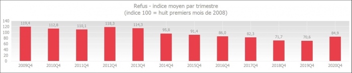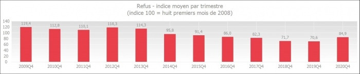 Le degré de refus a légèrement augmenté par rapport à celui du quatrième trimestre des trois années précédentes, mais il reste à un niveau historiquement bas. Compte tenu de la situation économique et sanitaire difficile, qui a certainement un impact négatif sur la qualité de très nombreuses demandes de crédits, il est remarquable que le degré de refus n'augmente pas davantage.