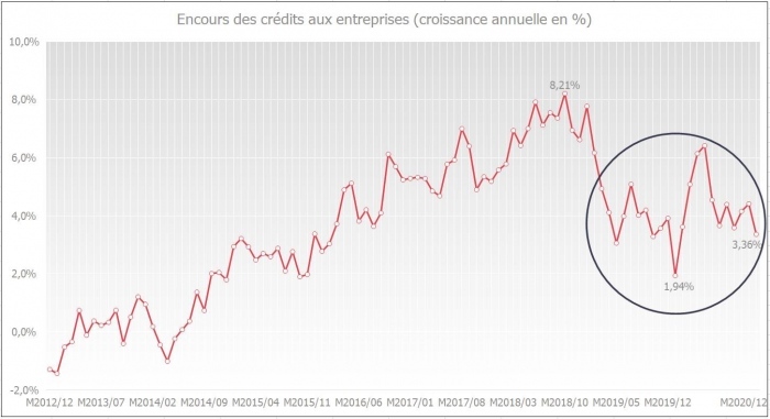 Le graphique ci-dessous montre que l’évolution d’une année sur l’autre a connu un tassement en 2019. Abstraction faite du bref bond positif au début de l'année 2020, au moment où les grandes entreprises, essentiellement, ont tiré sur leurs lignes de crédit pour disposer de suffisamment de liquidités dans cette situation incertaine, la croissance annuelle de juin à décembre 2020 a été à nouveau plus faible.