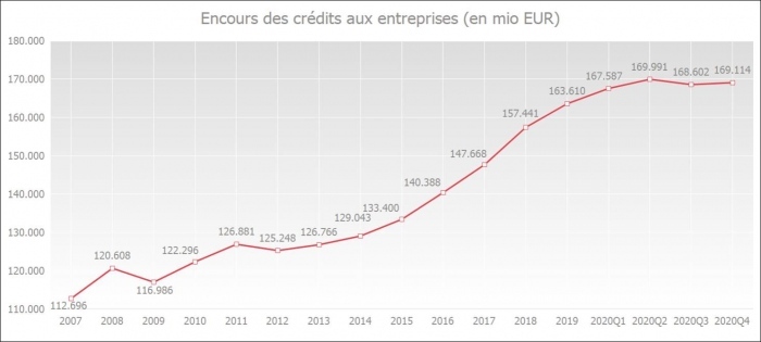Fin décembre 2020, l'encours des crédits aux entreprises qui ont été utilisés (y compris les crédits d'engagement, par ex. les crédits de garantie et les crédits documentaires) a augmenté pour atteindre un niveau de 169,1 milliards d'euros, contre 168,6 milliards d'euros fin septembre 2020 (+0,3 %).