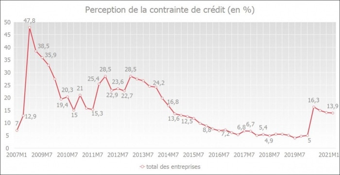 L'enquête trimestrielle de la Banque nationale de Belgique (BNB) montre que la perception des freins au crédit par les entreprises s'élevait à 13,9 % en janvier 2021. Le pourcentage est passé de 5,0 % en janvier 2020 à 16,3 % en avril 2020 et est redescendu à 13,9 % en janvier 2021. Cela signifie que la perception des freins au crédit est toujours considérablement plus faible que pendant la crise bancaire de 2008 - 2009.
