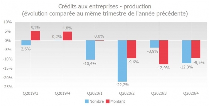 Le nombre de crédits octroyés a diminué au quatrième trimestre 2020 de 12,3 % par rapport au même trimestre de l'année précédente. Les montants accordés ont été inférieurs de 9,5 % à ceux du même trimestre de l'année précédente.