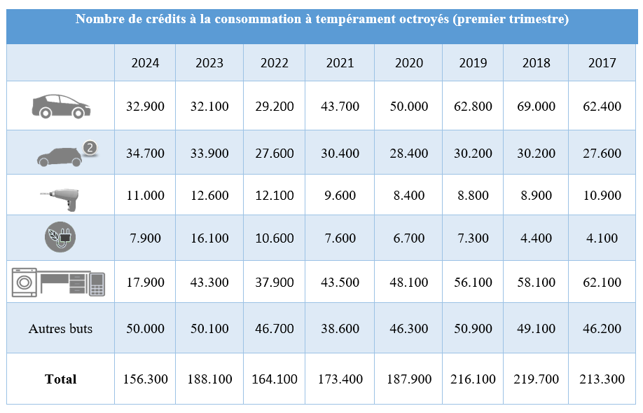 En revanche, on constate une augmentation des chiffres dans la catégorie des voitures. Au total, 67.600 crédits ont été accordés pour l'achat d'une voiture pour un montant total d’environ 1,3 milliard d’euros. Il s'agit d'une augmentation de 2,7 % par rapport à la même période de l'année dernière.
