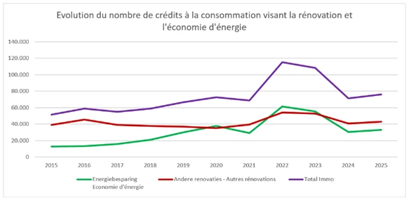 Le crédit à la consommation pour les rénovations a donc connu, en 2025, une hausse de 6,4% après 2 années en baisse. Le crédit à la consommation pour des rénovations autres a augmenté, en nombre, +5,4% et, en montant, +14,5% par rapport à 2024. En ce qui concerne les crédits pour des investissements écoénergétiques, comme l'installation d'une pompe à chaleur, de panneaux solaires ou d'une isolation supplémentaire, nous constatons également une hausse, en nombre, de 7,8% et 16,2%, en nombre, par rapport à 2024.