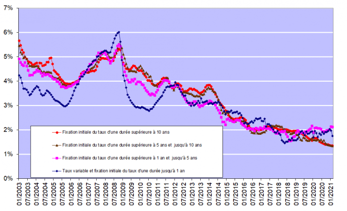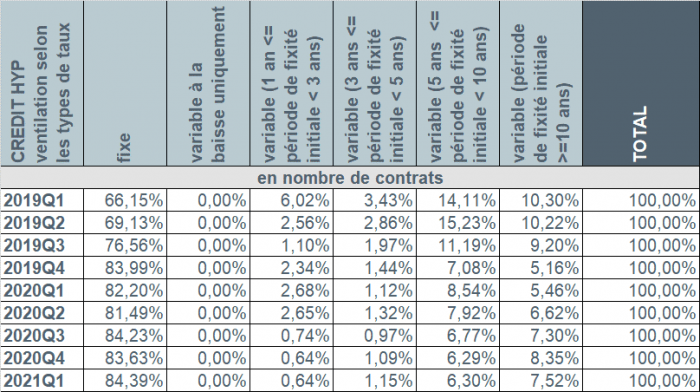 Au cours du premier trimestre 2021, de nouveau plus de 9 emprunteurs sur 10 (92%) ont opté pour un taux d’intérêt fixe ou un taux d’intérêt variable assorti d’une période initiale de fixité des taux de minimum 10 ans. Un peu moins de 7% des emprunteurs ont privilégié un taux d’intérêt variable assorti d’une période initiale de fixité des taux entre 3 et 10 ans. Le nombre d’emprunteurs ayant choisi un taux variable annuellement a atteint à peine 0,6%.