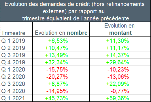 Le nombre de demandes de crédit a connu au premier trimestre 2021 une augmentation de 46%, hors refinancements, par rapport au même trimestre de l’année précédente. Le montant de crédit correspondant a également enregistré une progression, d’environ 59,5%.