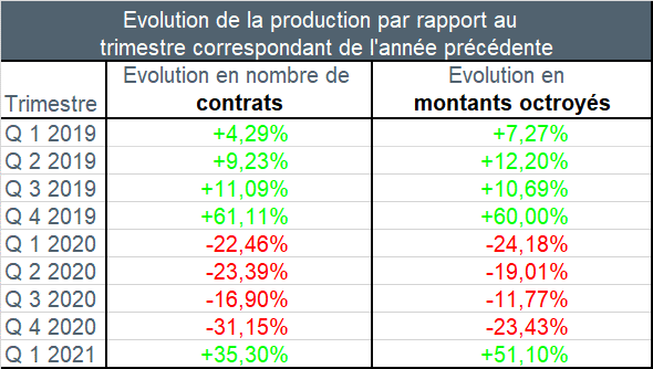 Au cours du premier trimestre de 2021, le nombre de crédits octroyés, hors refinancements externes, a connu une augmentation de plus de 35% par rapport au premier trimestre 2020. Le montant correspondant a augmenté de plus de 51%.