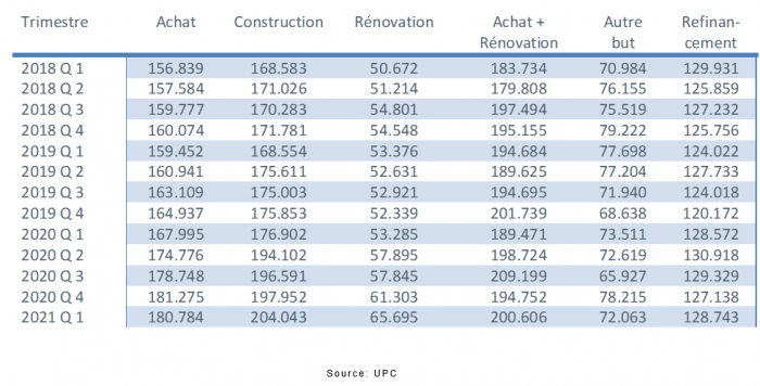 Comparativement au premier trimestre de 2020, le nombre de crédits contractés pour l’achat d’un logement (+8.973) a augmenté de plus de 38%. Le nombre de crédits pour l’achat avec transformation (+771) a augmenté de presque 36%, tout comme le nombre de crédits de construction (+2.368), qui a connu une augmentation de 42%. Le nombre de crédits pour d’autres destinations (+1.620) a quant à lui augmenté de 44%. Le nombre de contrats de crédit pour la rénovation d’un logement a également connu une augmentation au premier trimestre 2021, à savoir de +24,5%, soit 3.244 crédits en plus qu’au premier trimestre de 2020.