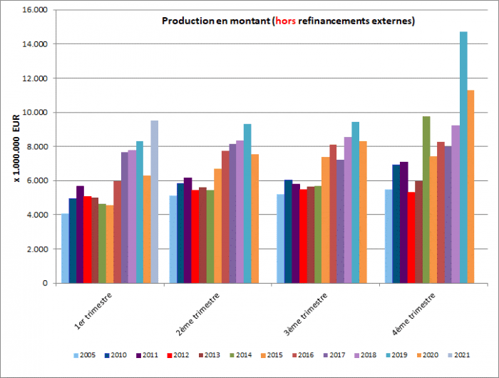 Au premier trimestre 2021, un peu plus de 65.000 nouveaux crédits ont été octroyés pour un montant total de quelque 9,5 milliards EUR – hors refinancements externes.