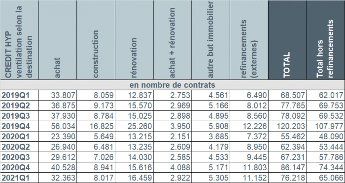 L’augmentation du nombre de demandes de crédit s’est manifestée pour toutes les destinations. Le nombre de demandes de crédit pour l’achat d’un logement (+15.788) a augmenté de 35,5%, celui pour l’achat + rénovation d’un logement (+3.212) de presque 69%. Le nombre de demandes de crédit pour la construction d’un logement (+6.411, soit +66,7%) et pour la rénovation d’un logement (+9.209, soit +55,3%) a également fortement augmenté, tout comme le nombre de demandes de crédit pour d’autres destinations (+2.359, soit +43,2%). Par ailleurs, au cours du premier trimestre de 2021, le nombre de demandes de refinancements externes a de nouveau connu une augmentation, en l’occurrence de 49%.