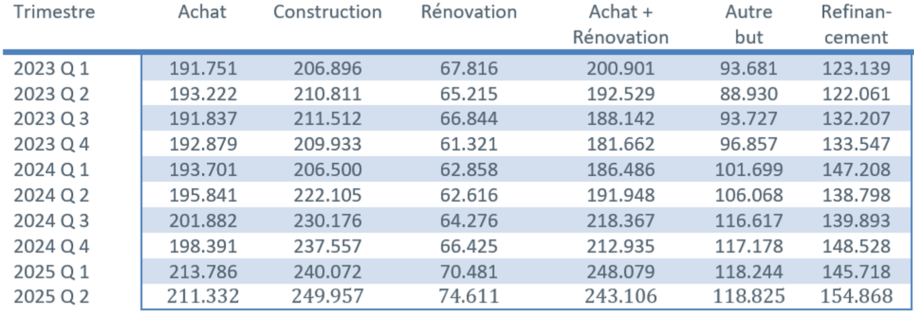 C’est surtout le montant moyen d’un crédit de construction qui a connu une forte augmentation au deuxième trimestre 2025, pour atteindre 250.000 EUR.