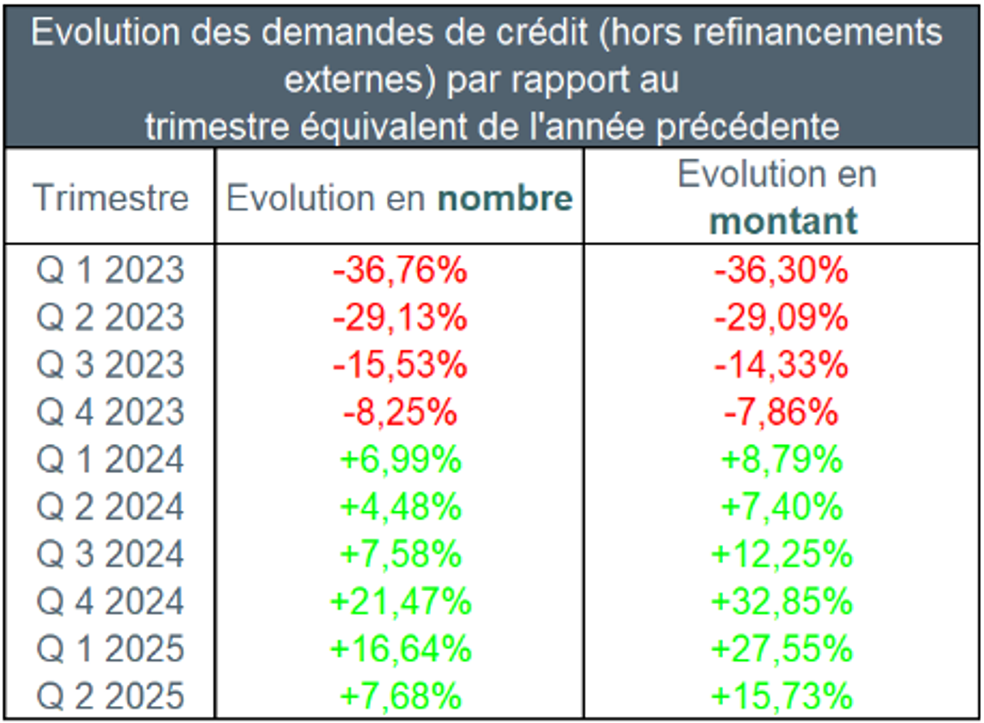 Du deuxième trimestre 2024 au deuxième trimestre de 2025, le nombre de demandes de crédit s’est accru d’environ 7,7%, hors refinancements. Le montant de crédit correspondant durant ce deuxième trimestre 2025 a également augmenté, d’un peu moins de 16%.