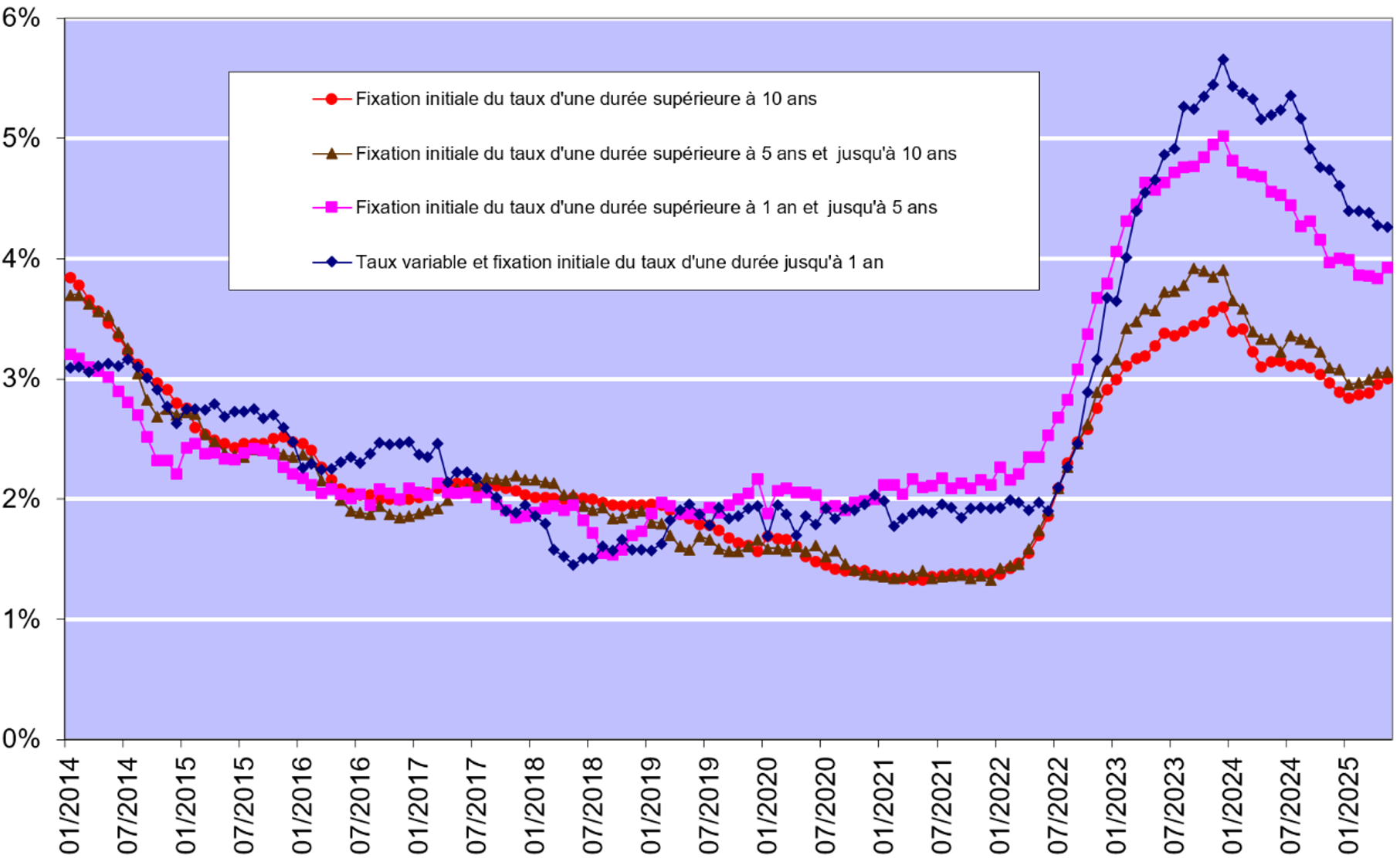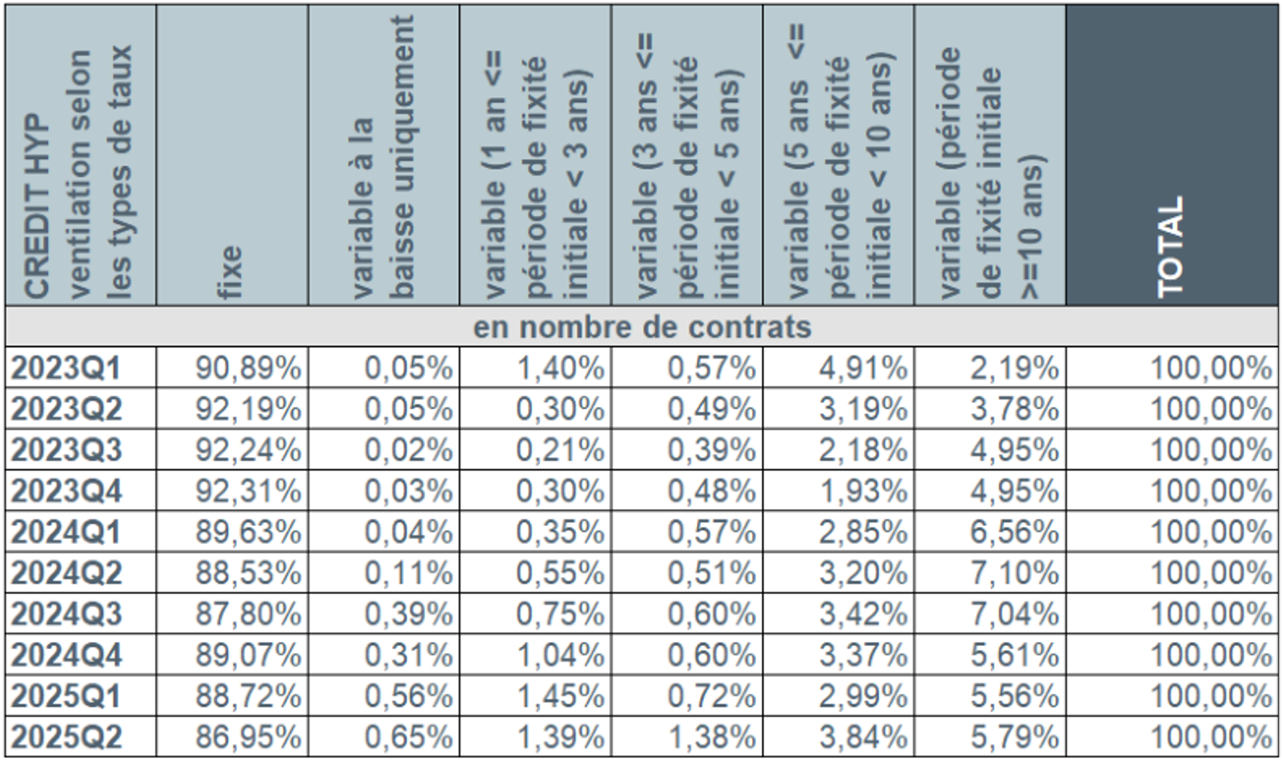 Au cours du deuxième trimestre 2025, plus de 9 emprunteurs sur 10 (92,7%) ont à nouveau opté pour un taux d’intérêt fixe ou un taux d’intérêt variable assorti d’une période initiale de fixité des taux de minimum 10 ans. Environ 5,2% des emprunteurs ont privilégié un taux d’intérêt variable assorti d’une période initiale de fixité des taux entre 3 et 10 ans. Un peu plus de 2% des emprunteurs ont choisi un taux variable annuellement.