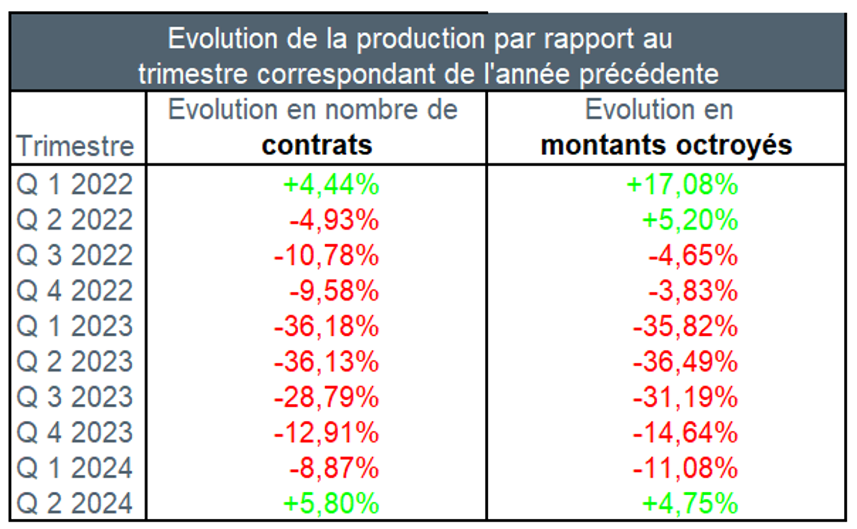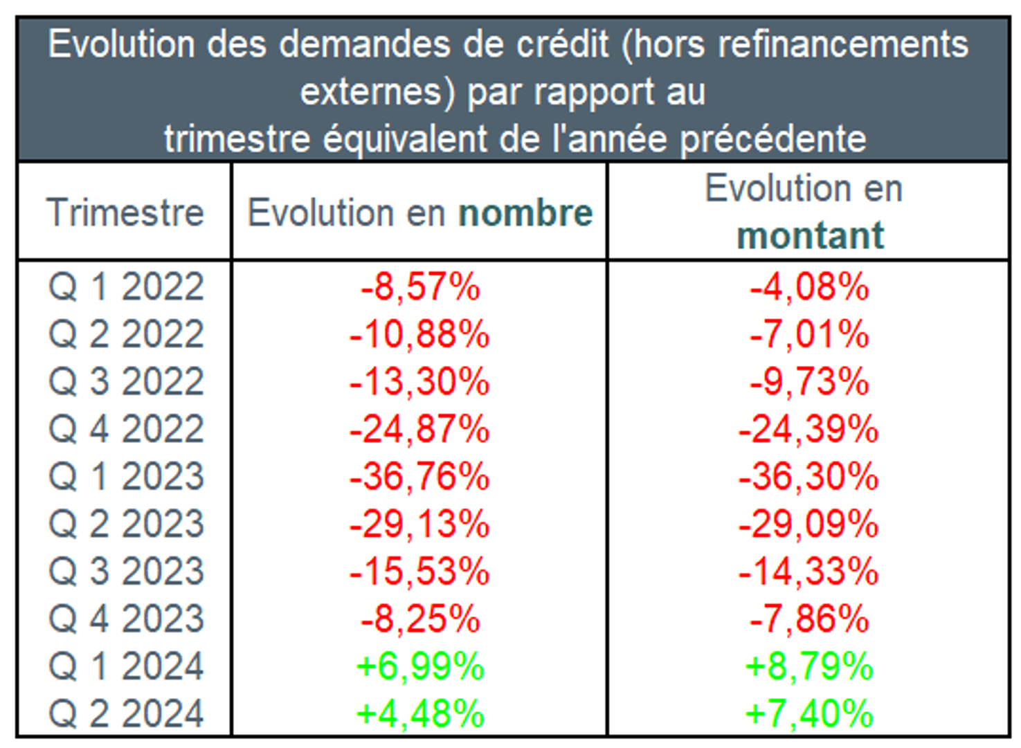 Du deuxième trimestre 2023 au deuxième trimestre de 2024, le nombre de demandes de crédit s’est accru d’environ 4,5%, hors refinancements. Le montant de crédit correspondant durant ce deuxième trimestre 2024 a également augmenté, d’un peu plus de 7%.