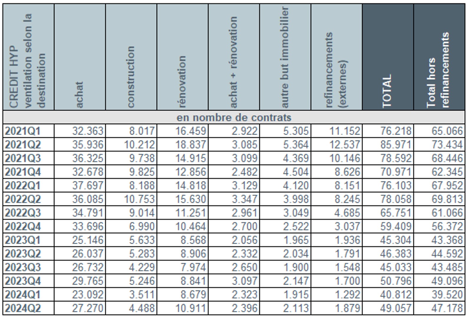 Comparativement au deuxième trimestre de 2023, le nombre de crédits contractés pour l’achat d’un logement (+1.233, soit +4,7%) ainsi que le nombre de crédits pour l’achat avec transformation (+64, soit +2,7%) ont connu une légère augmentation, tout comme le nombre de crédits pour d’autres destinations (+79), qui a noté une augmentation de +3,9%. Quant au nombre de contrats de crédit pour la rénovation (+2.005, soit +22,5%), il connait la plus forte hausse. Mais c’est le nombre de crédits de construction d’un logement qui, avec une contraction de -15%, soit 795 crédits de moins qu’au deuxième trimestre de 2023, a connu la seule diminution au cours de ce trimestre.