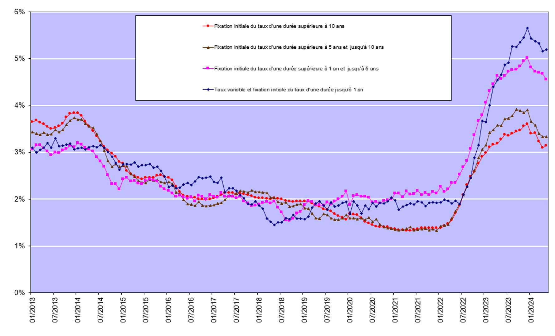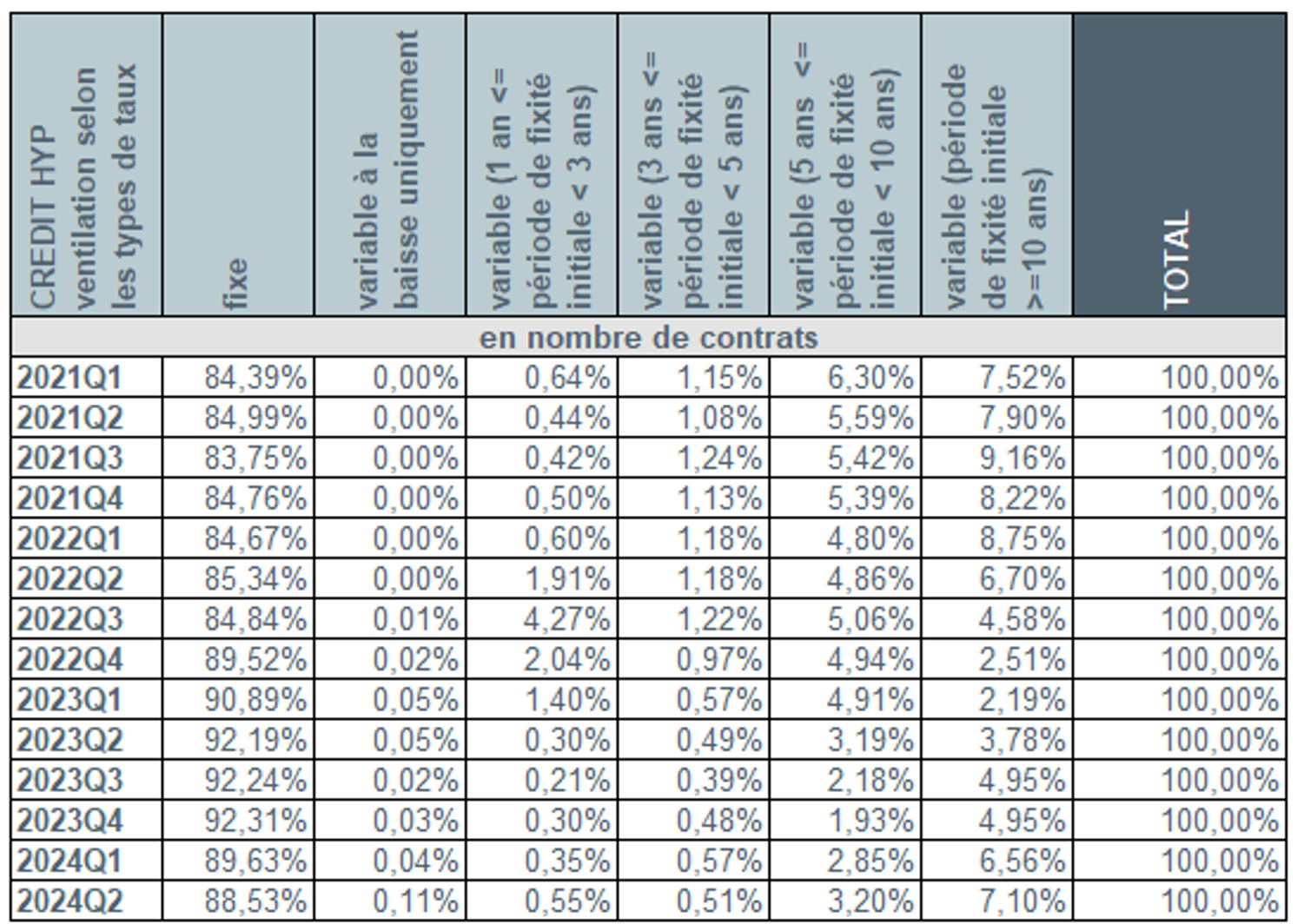 Au cours du deuxième trimestre 2024, plus de 9 emprunteurs sur 10, plus précisément 95,6%, ont à nouveau opté pour un taux d’intérêt fixe ou un taux d’intérêt variable assorti d’une période initiale de fixité des taux de minimum 10 ans. Un peu plus de 4% des emprunteurs ont privilégié un taux d’intérêt variable assorti d’une période initiale de fixité des taux entre 3 et 10 ans. A peine 0,5% des emprunteurs ont choisi un taux variable annuellement.