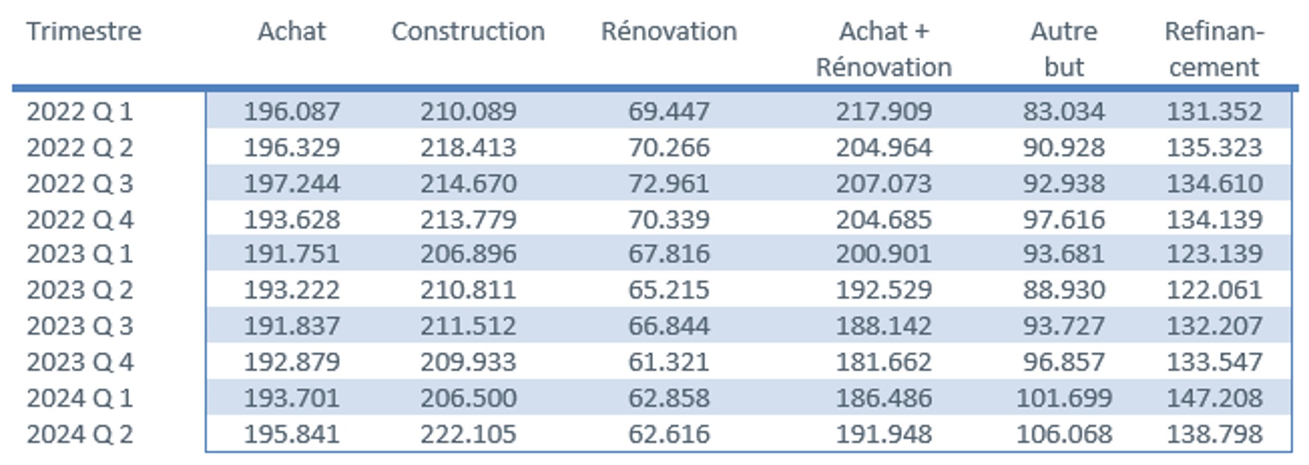 Le montant moyen emprunté pour l’achat d’un logement a quant à lui légèrement augmenté au deuxième trimestre 2024, pour atteindre environ 196.000 EUR. Le montant moyen pour un crédit de construction a connu une forte augmentation et atteint 222.000 EUR au deuxième trimestre 2024. Tout comme, le montant moyen d’un crédit pour achat + rénovation a continué à augmenter au trimestre précédent, pour atteindre 192.000 EUR.