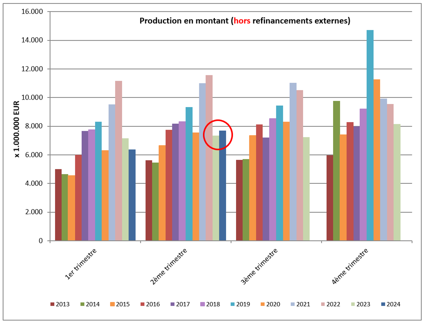 Au deuxième trimestre 2024, un peu plus de 47.000 nouveaux crédits ont été octroyés pour un montant total d’un peu plus de 7,7 milliards EUR – hors refinancements externes. Ce nombre, pour le second trimestre 2024, reste faible et le plus bas enregistré pour un trimestre depuis 2014, à l’exception de l’année 2023.