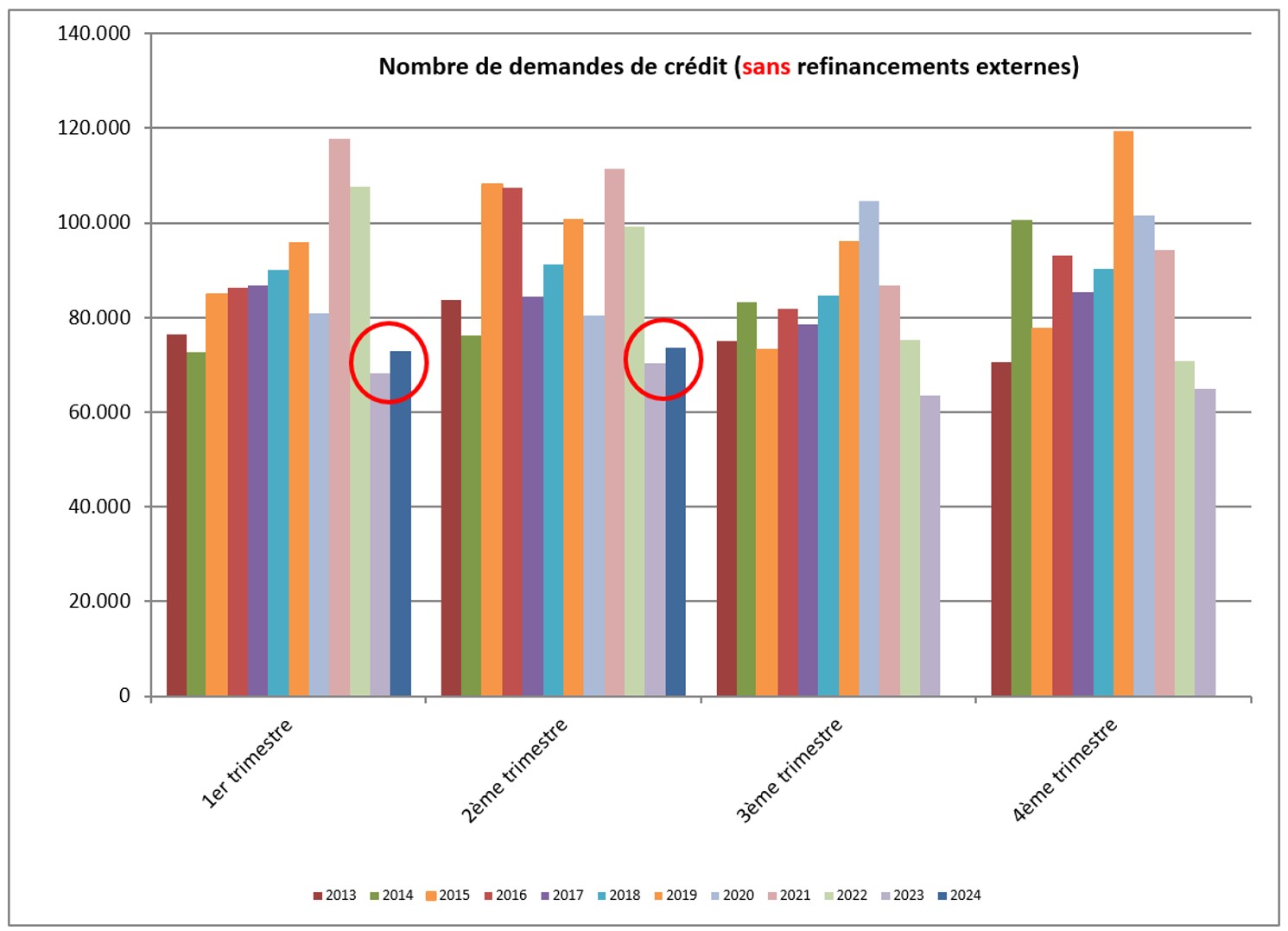 Le nombre de demandes de crédit, hors celles relatives aux refinancements externes, a connu au deuxième trimestre 2024 une augmentation d’environ 4,5% par rapport au même trimestre de l’année précédente. Le montant sous-jacent des demandes de crédit a également signé une augmentation de 7,4%. Pour le deuxième trimestre consécutif, le nombre de demandes de crédit pour les trimestres visés (celles pour les refinancements n’étant pas reprises) retrouve la tendance positive après 10 trimestres de baisse.