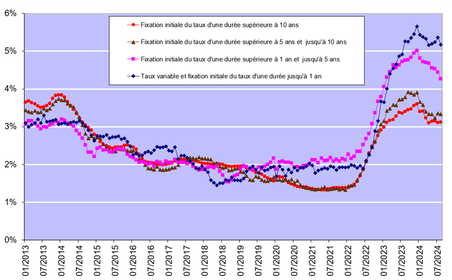 Au cours du troisième trimestre 2024, plus de 9 emprunteurs sur 10, plus précisément 95%, ont à nouveau opté pour un taux d’intérêt fixe ou un taux d’intérêt variable assorti d’une période initiale de fixité des taux de minimum 10 ans. Environ 4% des emprunteurs ont privilégié un taux d’intérêt variable assorti d’une période initiale de fixité des taux entre 3 et 10 ans. Moins de 1% des emprunteurs ont choisi un taux variable annuellement.